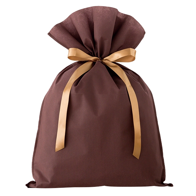 リボン付きでブラウンカラーの不織布巾着バッグです。無地でカラーバリエーションがあるので高級やナチュラルテイストなどお店のイメージに合わせてお使いいただけます。リボンがついていることで、入れて結ぶだけでラッピングが完成するので、クリスマス、母の日、父の日などの忙しいギフトシーズンにもおすすめの時短ラッピングアイテムです。