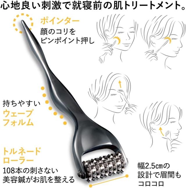 気になるたるみにコロコロするだけ、1回転で108本の鍼がたるんだ表情筋を刺激。