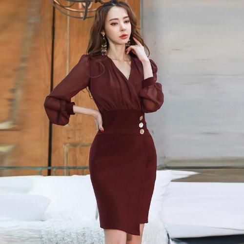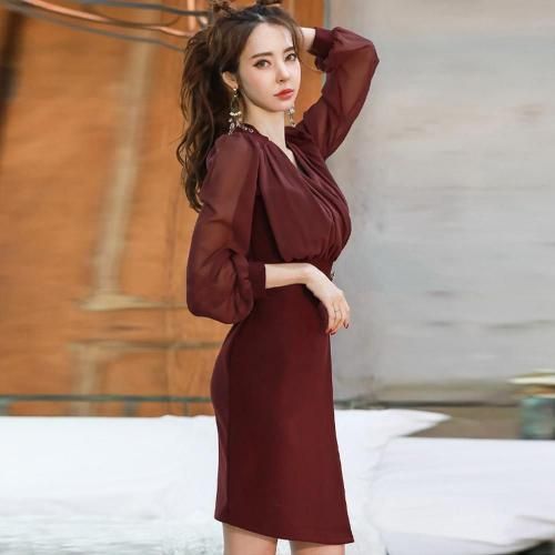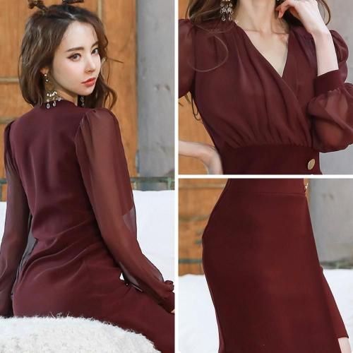 【グラシア】 キャバ ドレス キャバドレス ワンピース ミディアムドレス カシュクール クール 軽やか 大人 透け感 優しい ワインレッド S M L XL