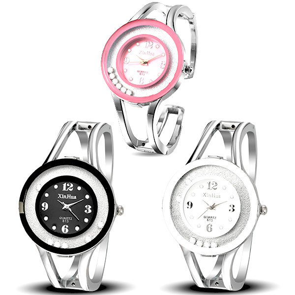 シンプルでモダンなシルバーバングルに、ハッキリとしたカラーの大きめフェイス。中で揺れるラウンドストーンがかわいい、レディースモデルの腕時計です。