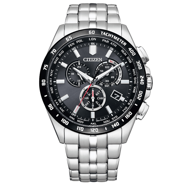 世界の時差を表示するワールドタイム機能を搭載した、エコ・ドライブ電波時計クロノグラフモデル。