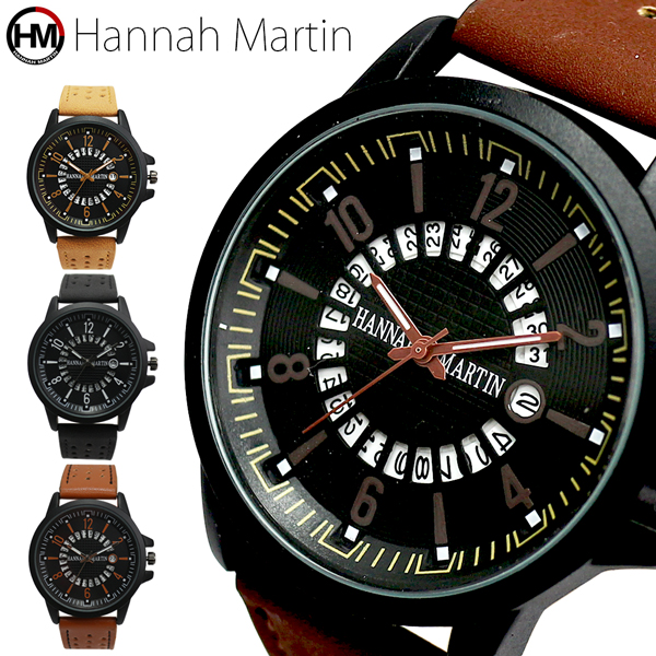 文字盤1周カレンダー付 近代的デザイン パンチングベルトで手元魅せ HM003 Hannah Martin メンズ 腕時計 メンズ腕時計