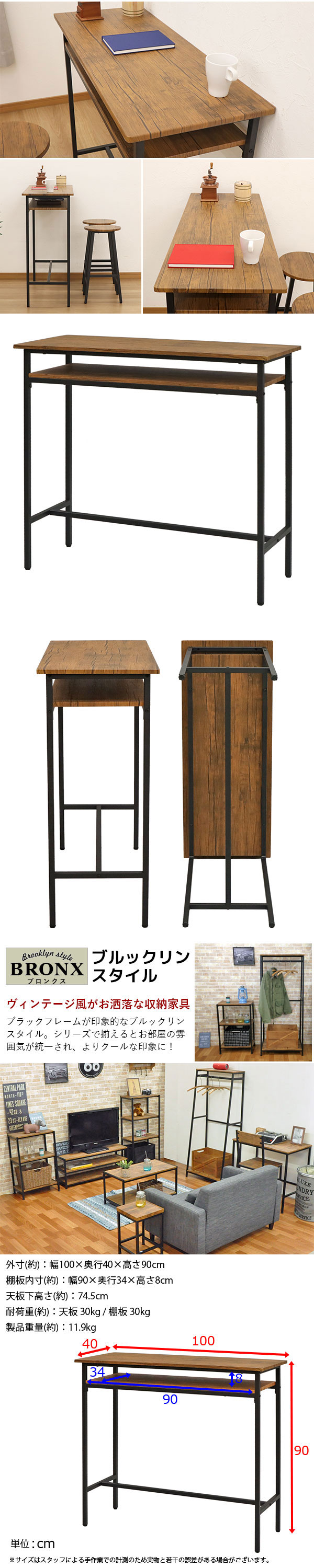 商品名:カウンターテーブル 立ち テーブル 90高 100幅 立ちテーブル 立ちデスク 幅100cm 奥行40cm 高さ90cm スタンディングデスク スタンディングテーブル コーヒーテーブル カフェテーブル 立ち 作業 机 ヴィンテージ風 シンプル おしゃれ かわいい ブラック 黒 アイアンフレーム
