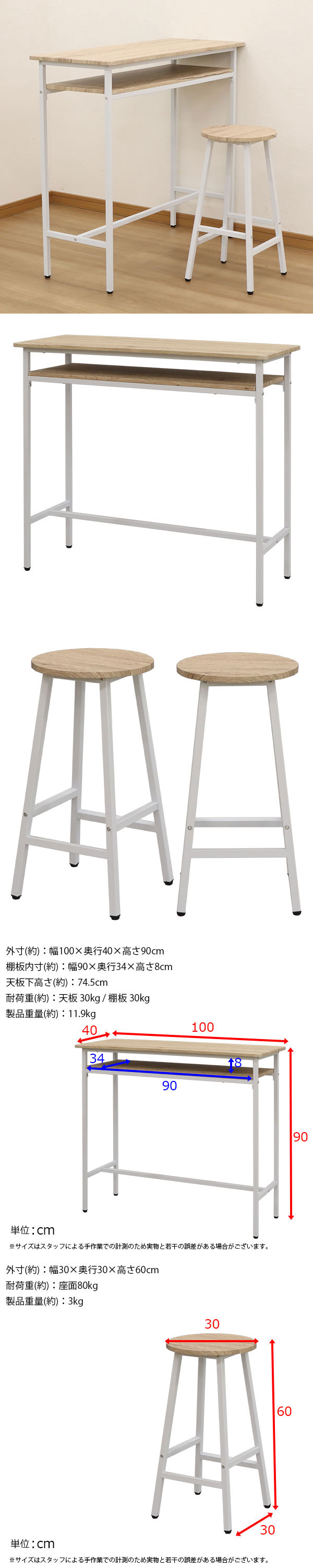カウンターテーブル 2点セット スツール 1脚 90高 100幅 コーヒーテーブル カフェテーブル キッチンチェア バーチェア ハイチェア カウンターチェア ダイニングチェア カフェチェア 作業 机 丸 椅子 ヴィンテージ風 シンプル おしゃれ かわいい ホワイト 白 アイアンフレーム