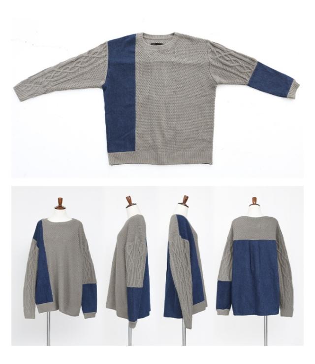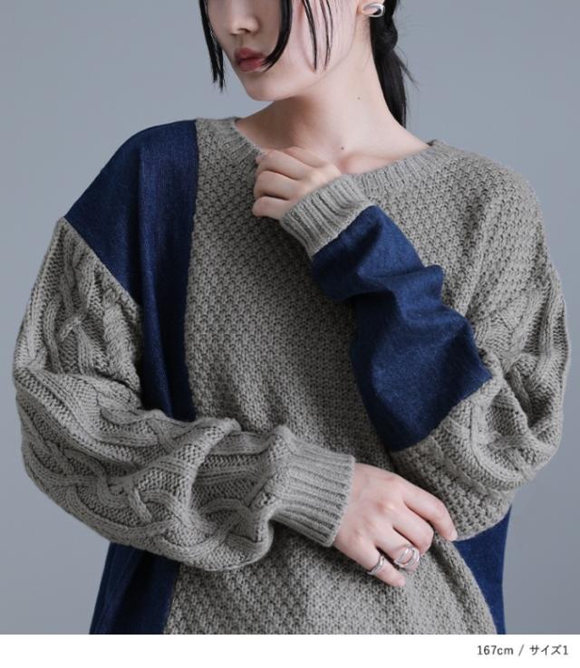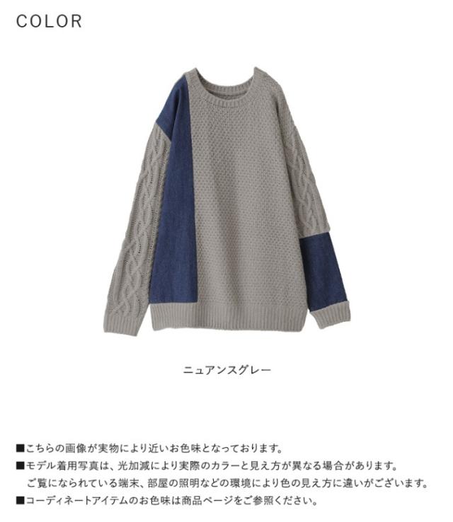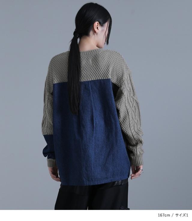 『kOhAKUデニム切替ケーブル袖ニット』 【メール便不可】【20】[ニット レディース ユニセックス 秋冬 トップス セーター 長袖 プルオーバー アシメ アシンメトリー 配色 異素材 切替 オーバーサイズ tik0424]