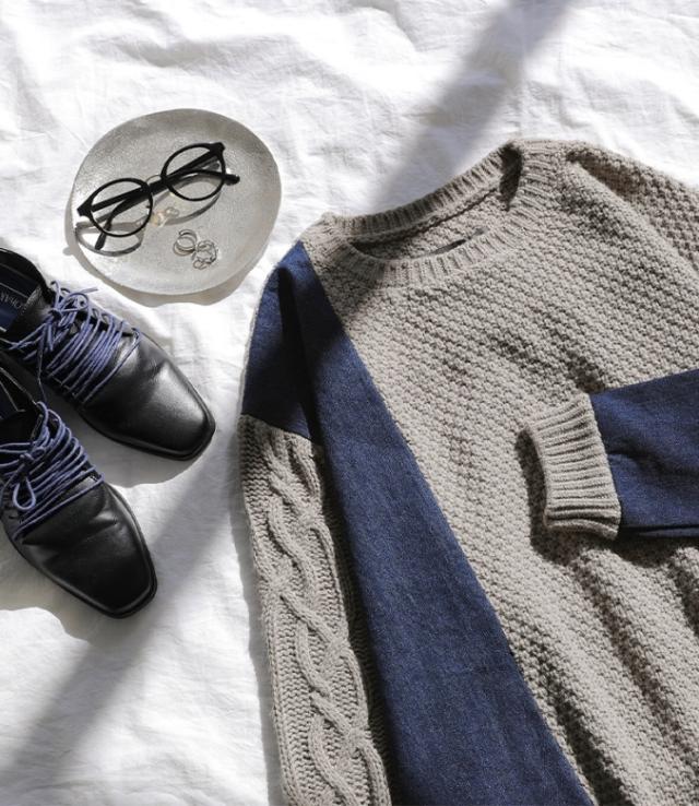 ■デザイン ニットとデニムをアシンメトリーに切り替えた、配色感のあるトップス。ボリュームのある袖のケーブル編みと長めの着丈で、ラフなモード感を堪能できます。ユニセックスで着られるゆるっとしたサイズ感とデザインも嬉しいポイント。 ■コーディネート 配色感を楽しめるトップスなので、ボトムスはシンプルなアイテムがおすすめ。シューズはキレイめなブーツを合わせてバランスをとったり、スニーカーでラフに着てもお洒落に決まります。 ■素材 太めの糸でざっくり編まれた、柔らかな肌触りのニット。ニットの身頃は鹿の子編み、袖は幅広のケーブル編みで表情豊かな印象に。デニム部分は肌に優しく着心地の良いコットン100%素材です。 |
