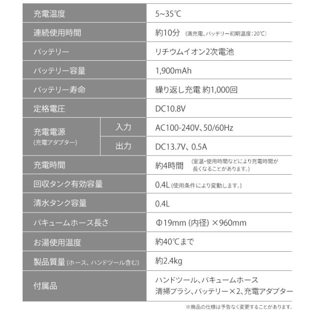 ハンドツール、バキュームホース、清掃ブラシ、バッテリー×2、充電アダプター