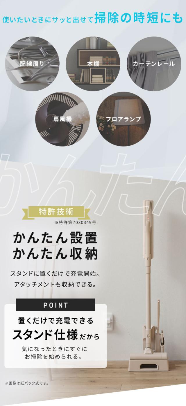 充電スタンド付きなので、お掃除が終わったらスタンドに置くだけで充電でき、アタッチメントも収納できます。