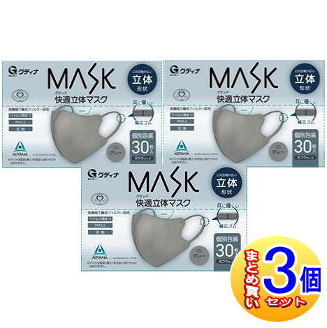 【3個セット】グディナ 快適マスク立体 30枚入(個別包装) グレー【小型宅配便】