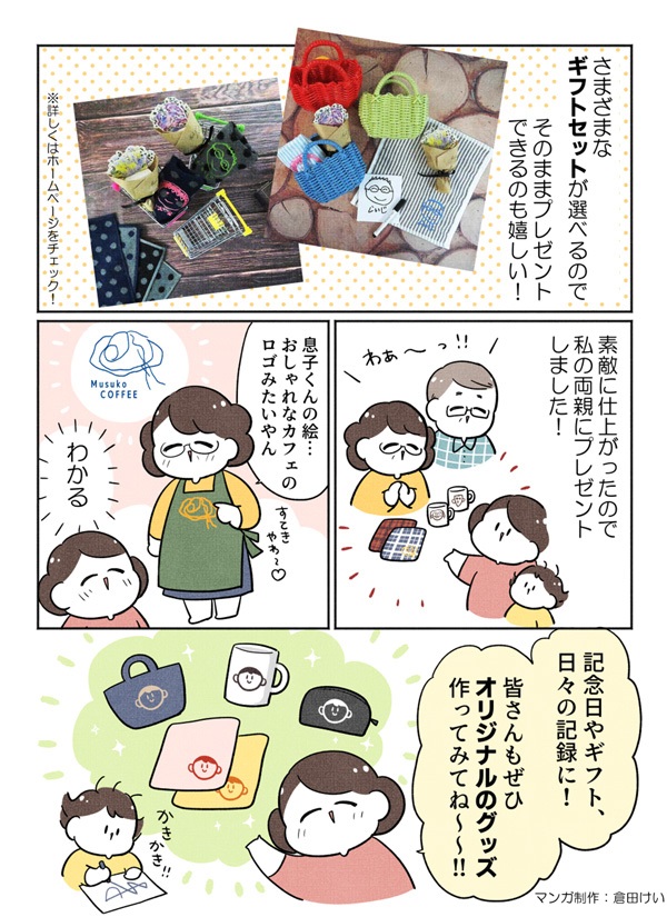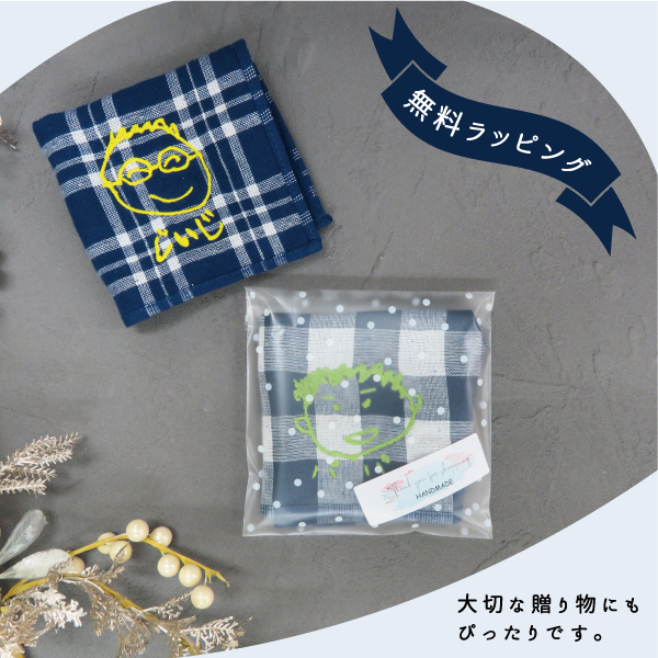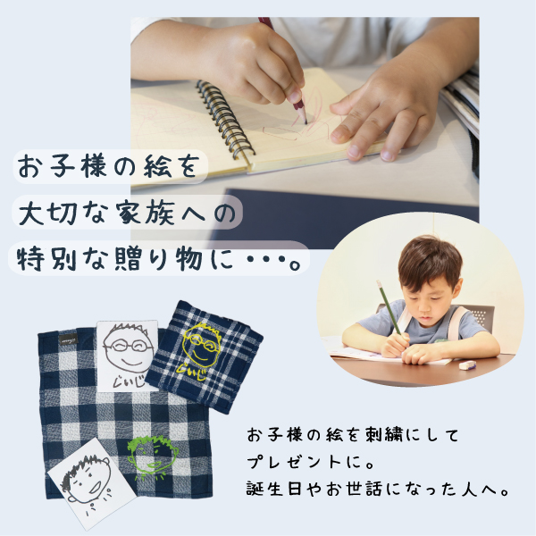 子どもが書いたお父さん、おじいちゃん、おばあちゃんの絵がそのままタオルハンカチに刺繍されるオリジナル商品。メッセージも刺繍できるので・・還暦・長寿祝いギフトにピッタリ。