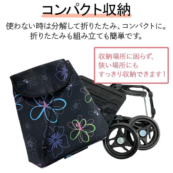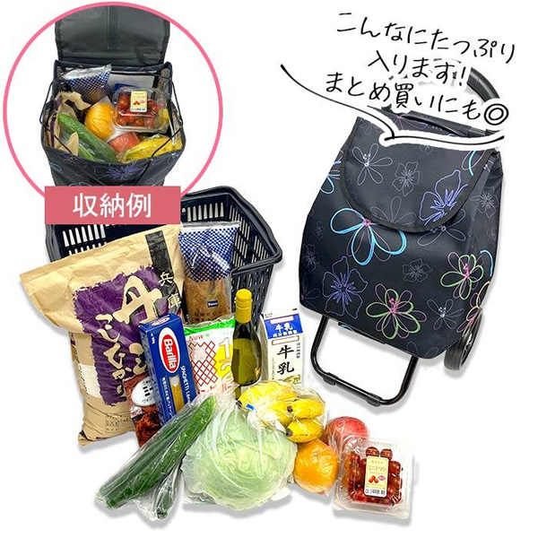 ・ 大きなタイヤでたっぷり収納しても静音でスムーズな移動ができるショッピングカート。