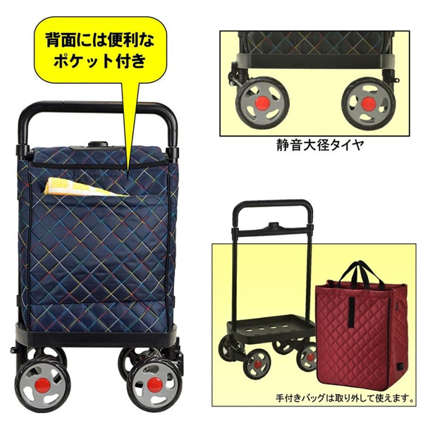 ・ 足さばきが楽な横押しで使用できる4輪軽量タイプ。 ・ 食料品などまとめ買いする時など便利な大容量! ・ バッグ部分は簡単に取り外せ、室内への移動も楽々! ※ 歩行を補助するシルバーカーではありません。 ■サイズ:高さ680mm × 横幅400mm × 厚み260mm ■袋サイズ:高さ390mm × 横幅320mm × 厚み210mm ■最大高:約900mm ■重量:約2,400g ■耐荷重:約13kg ■容量:約24リットル ■素材:ポリエスター( キルト加工 ) ■生産地:中国製( 企画:日本 ) ■ブランド:VALENTINO VISCANI(ヴァレンチノ ビスカーニ) ■仕様… 【背面】 ・アテポケット ■その他… ・4段調節キャリーバー ・大径タイヤ(旋回ロック機能付き) ・本体袋にテープ取っ手付き ・底板付き ※商品説明画像には色・柄違いの商品も使用しております。 ※この商品は、お客様による組み立てが必要です。 ※素材の特性上、においが気になる場合があります。風通しのよいところで陰干ししてからご使用ください。 ※記載は商品仕様の一部です。仕様説明不足等の理由での返品はできません。特に適合等は必ずご確認ください。