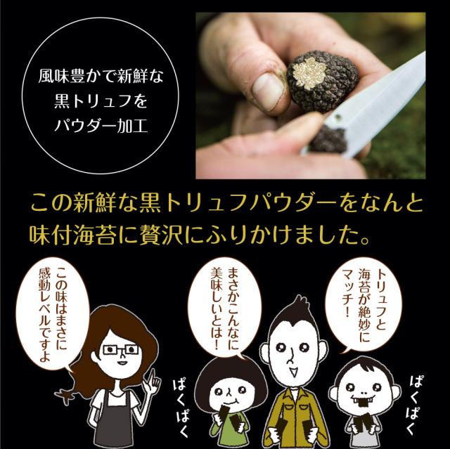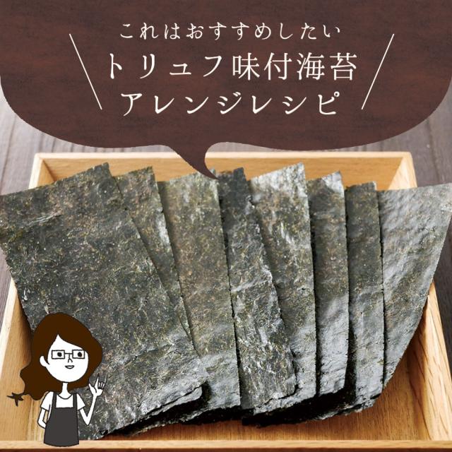 乾のり(有明海産)、トリュフパウダー(食塩、イナゴマメ粉末、きのこエキス粉末、酵母エキス粉末、黒トリュフ粉末)、調味液(砂糖、しょうゆ、魚介エキス(こんぶエキス、かつお節エキス、魚介エキス、えびエキス)、食塩、発酵調味料)/香料、調味料(アミノ酸等)、甘味料(ステビア、カンゾウ、スクラロース)、香辛料抽出物、(一部にえび・小麦・大豆を含む)