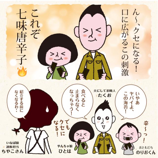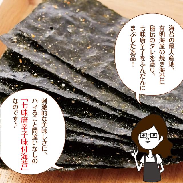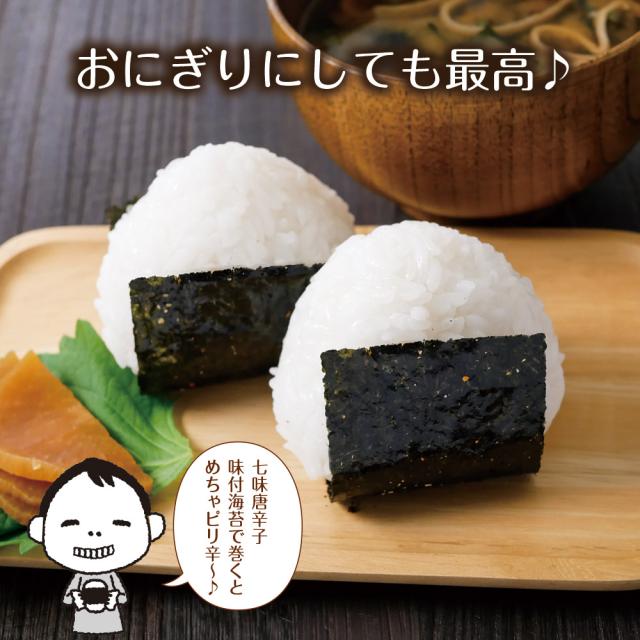 - 七味味の海苔は初めて食べて、海苔本来の味にプラス程よい辛さがとても美味しかったので、また購入します。