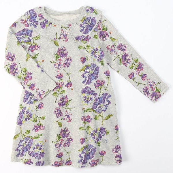 オリジナルのパンジークロスステッチプリント。衿を付け少しお上品に。後ろは腰回りで切り替えたデザイン。毛足の短いミニ裏毛を使用したワンピースです。