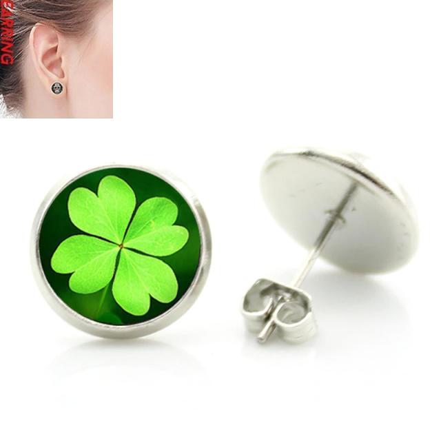 良いことあるそうな四つ葉のクローバーをデザインした丸いカボションをスタッドピアスにセットしたオシャレなファッションピアス。