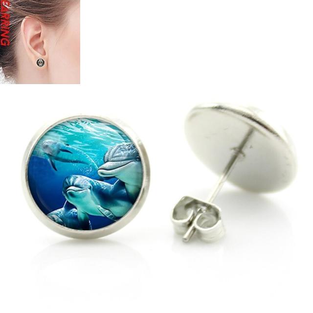 可愛いイルカがたくさん泳ぐ様子をデザインした丸いカボションをスタッドピアスにセットしたオシャレなファッションピアス。