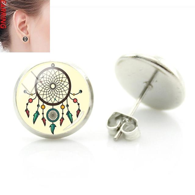 インディアンジュエリーの中でも人気のドリームキャッチャーをデザインした丸いカボションをスタッドピアスにセットしたオシャレなファッションピアス。