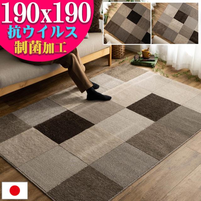 ラグ カーペット 日本製 190×190 2畳 ブロック柄 ラグマット 抗ウイルス 制菌加工 防ダニ おしゃれ モダン カジュアル 床暖房 ダイニング リビング ラグカーペット 絨毯 じゅうたん オールシーズン SEKマーク 送料無料