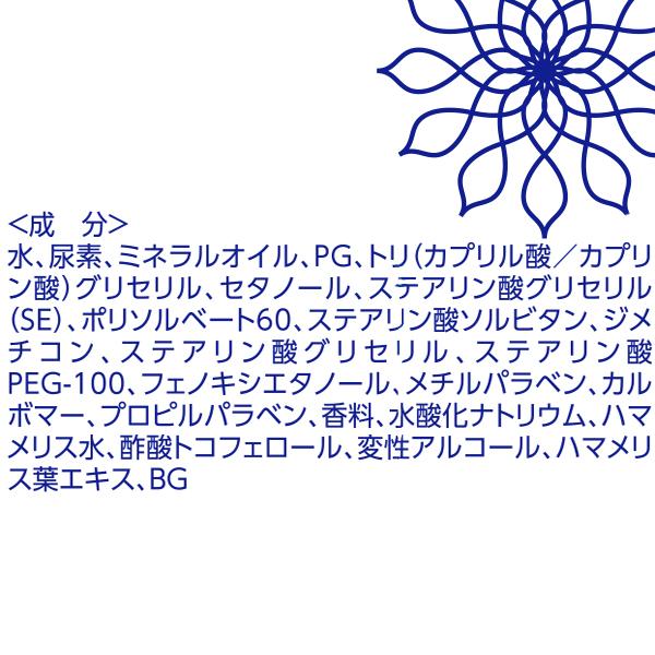 | 水、尿素、ミネラルオイル、PG、トリ(カプリル酸/カプリン酸)グリセリル、セタノール、ステアリン酸グリセリル(SE)、ポリソルベート60、ステアリン酸ソルビタン、ジメチコン、ステアリン酸グリセリル、ステアリン酸PEG-100、フェノキシエタノール、メチルパラベン、カルボマー、プロピルパラベン、香料、水酸化ナトリウム、ハマメリス水、酢酸トコフェロール、変性アルコール、ハマメリス葉エキス、BG |