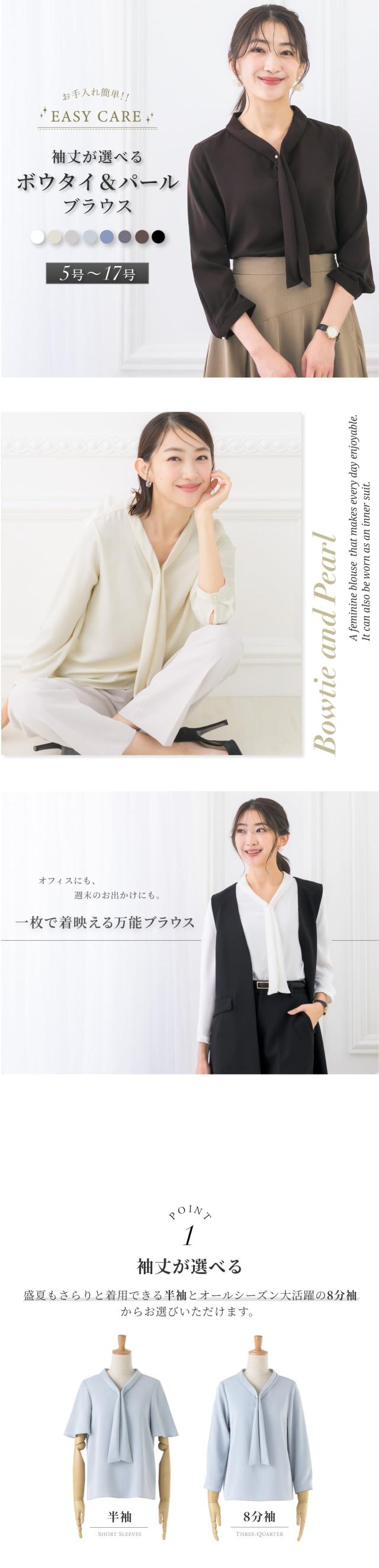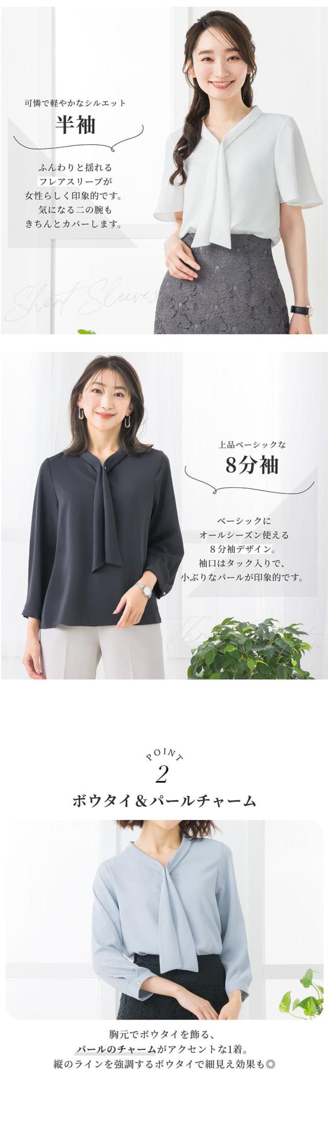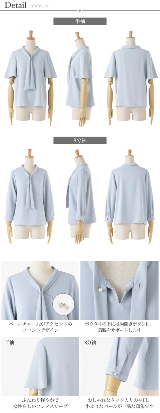 | 胸元で揺れるボウタイをパールチャームで飾ったフェミニンなブラウス 袖丈は、盛夏にも軽やかに過ごせる半袖、オールシーズン大活躍の8分袖からお選びいただけます。 適度に開いたく首周りは女性らしい曲線を作り、 デコルテを魅せることで華奢見えするのも嬉しいポイントです。 半袖はふんわり軽やかなフレアスリーブで女性らしい印象。 8分袖は袖口にもパールを1粒あしらい、上品で可愛らしい印象。 胸元のパールはチャームは取り外しが可能で、シンプルなボウタイとしてもご着用いただけます。 テレワークでの会議では、画面越しでもきちんと見えておすすめです。 生地はさらっとした柔らかい肌触り。 ロングシーズン着まわせて、シワになりにくい優秀素材です。 程よいハリがありながら毛玉になりにくく、キレイ見えする生地のため扱いやすいところも魅力的。 スーツに合わせるだけで華やかに見え、 オフィスやデイリーはもちろん、フォーマルシーンにも活躍する一着です。 | |