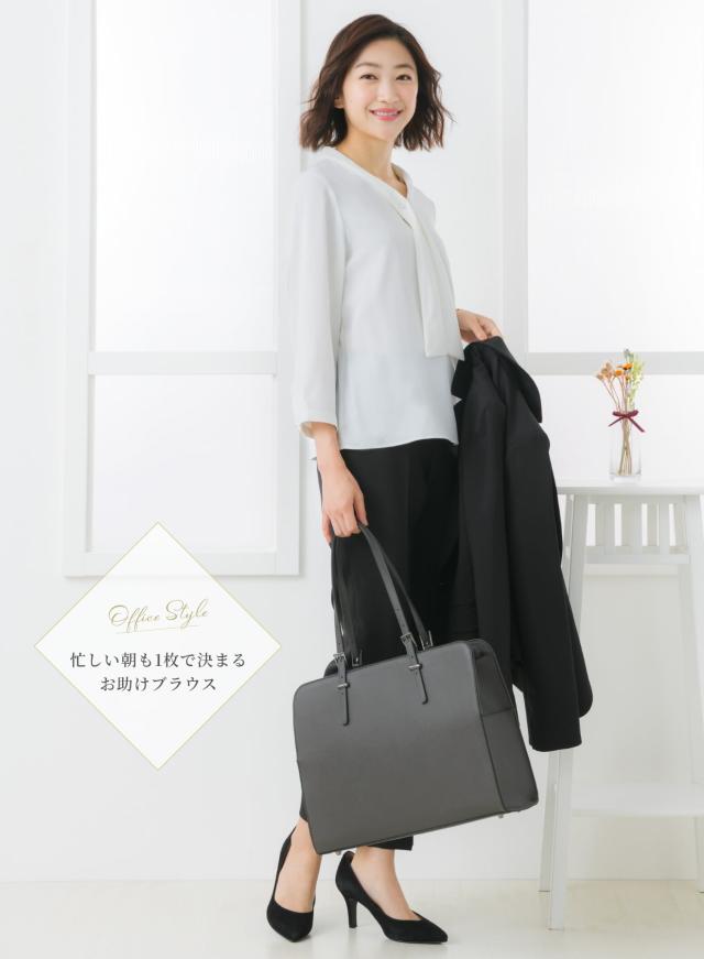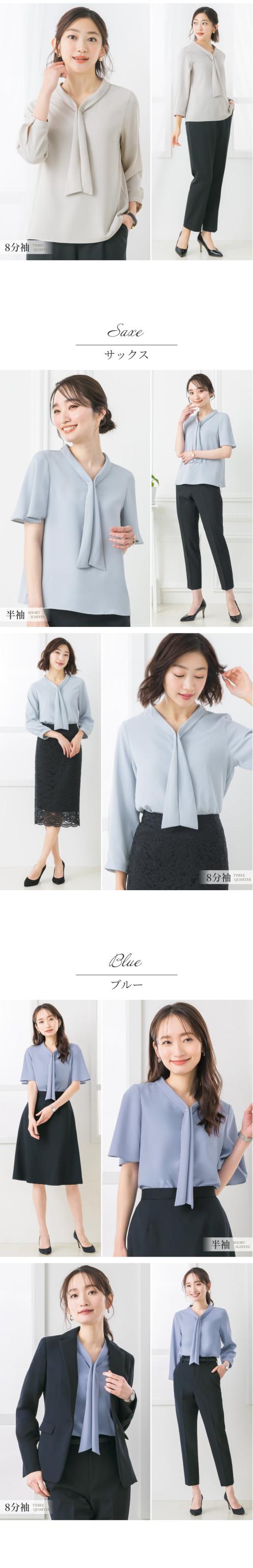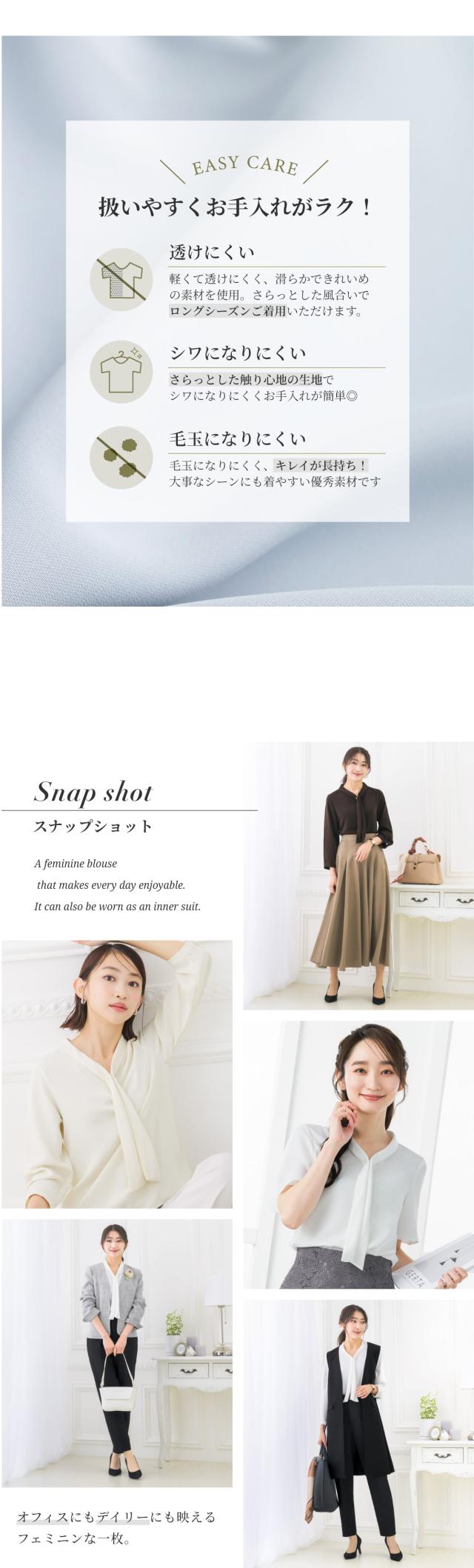 | 胸元で揺れるボウタイをパールチャームで飾ったフェミニンなブラウス 袖丈は、盛夏にも軽やかに過ごせる半袖、オールシーズン大活躍の8分袖からお選びいただけます。 適度に開いたく首周りは女性らしい曲線を作り、 デコルテを魅せることで華奢見えするのも嬉しいポイントです。 半袖はふんわり軽やかなフレアスリーブで女性らしい印象。 8分袖は袖口にもパールを1粒あしらい、上品で可愛らしい印象。 胸元のパールはチャームは取り外しが可能で、シンプルなボウタイとしてもご着用いただけます。 テレワークでの会議では、画面越しでもきちんと見えておすすめです。 生地はさらっとした柔らかい肌触り。 ロングシーズン着まわせて、シワになりにくい優秀素材です。 程よいハリがありながら毛玉になりにくく、キレイ見えする生地のため扱いやすいところも魅力的。 スーツに合わせるだけで華やかに見え、 オフィスやデイリーはもちろん、フォーマルシーンにも活躍する一着です。 | |