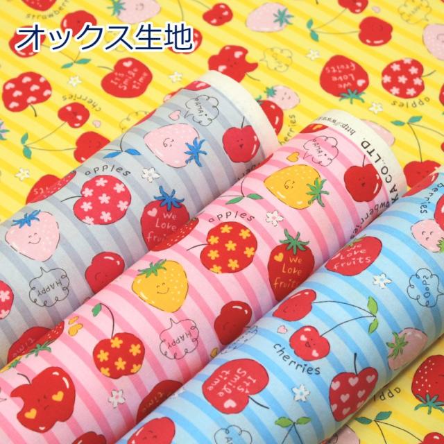 【10cm単位価格】 ストロベリー アップル チェリー ストライプ フルーツ柄 smile time 綿100% オックス 生地 布 約110cm幅 ゆうパケット2m対応