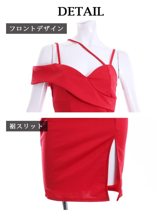 ☆オフショルダーになったキャミドレスの肩紐はアシンメトリーデザインとなっておりシンプルな無地ドレスにお洒落感をプラス!またがっつり見せた谷間でセクシーさもしっかりアピールできちゃうタイトです。