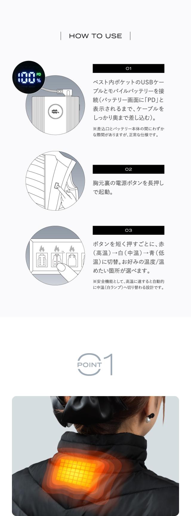 1ベスト内ポケットのUSBケーブルとモバイルバッテリーを接続(バッテリー画面に「PD」と表示されるまで、ケーブルをしっかり奥まで差し込む)。