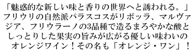 「魅惑的な新しい味と香りの世界へと誘われる。」フリウリの自然派パラスコスがリボッラ、マルヴァジア、フリウラーノの3品種で造るまろやかな酸としっとりした果実の旨みが広がる優しい味わいのオレンジワイン!その名も「オレンジ・ワン」!