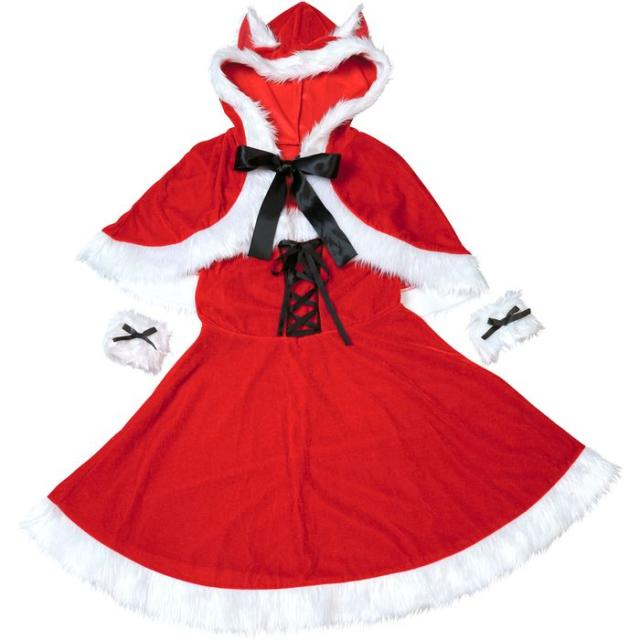 ■商品名:XM ミミノエル ねこケープサンタ フード付きケープ ワンピース カフス 透明ストラップ 仮装 コスプレ 衣装 忘年会 クリスマス ハロウィン イベント 誕生日