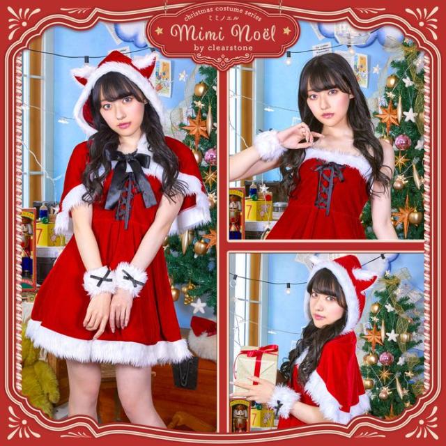 即納 XM ミミノエル ねこケープサンタ フード付きケープ ワンピース カフス 透明ストラップ 仮装 コスプレ 衣装 忘年会 クリスマス ハロウィン イベント 誕生日 クリアストーン 4560320899778