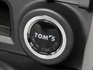 エンジンスタートの瞬間から、特別な車であることを主張するTOM'Sロゴ入りプッシュスタートボタン。