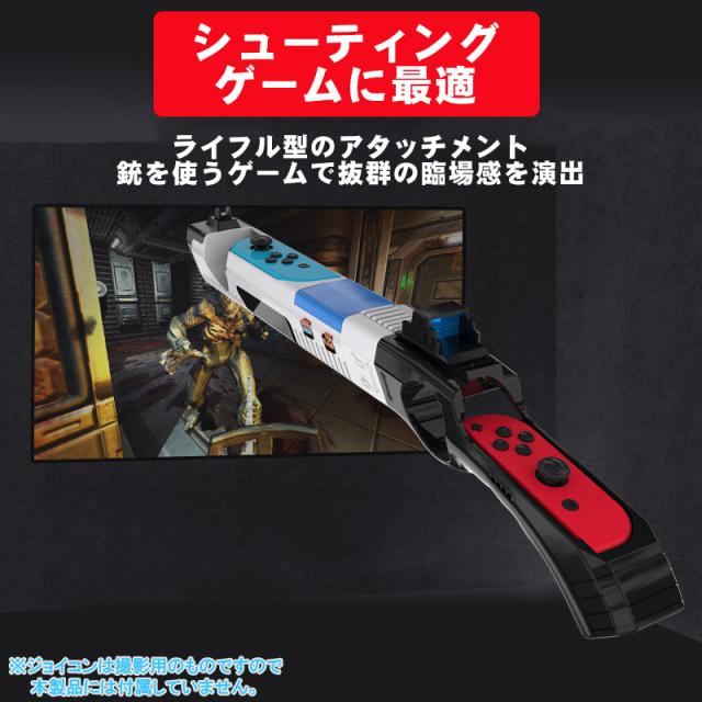 | 銃撃ゲームで抜群の臨場感が楽しめるライフル型のアタッチメントです。 Joy-Conを斜めから押し込むようにセットするだけで簡単装着できます。 スプラトゥーンなどJoy-Con対応の様々なシューティングゲームに対応します。 耐久性に優れたABS素材でお手入れも簡単です。 サイドにSwitchのゲームカードを4枚収納出来るカードスリット付き。 |