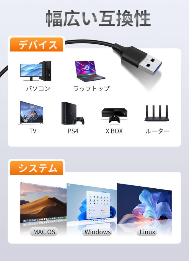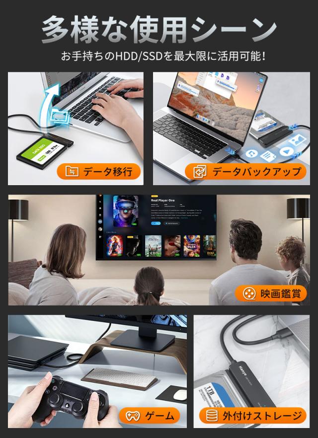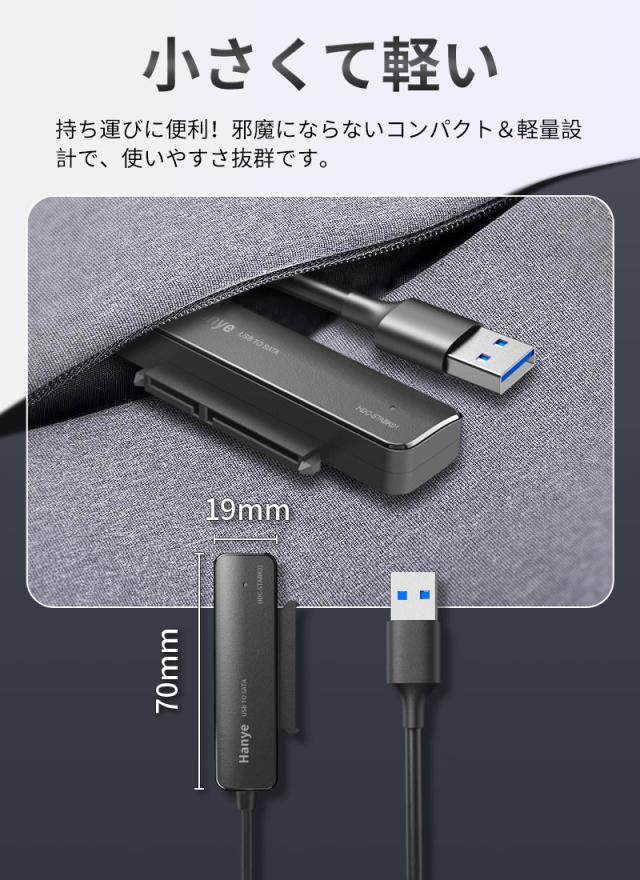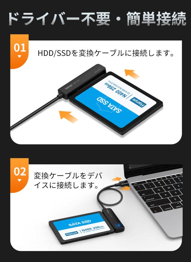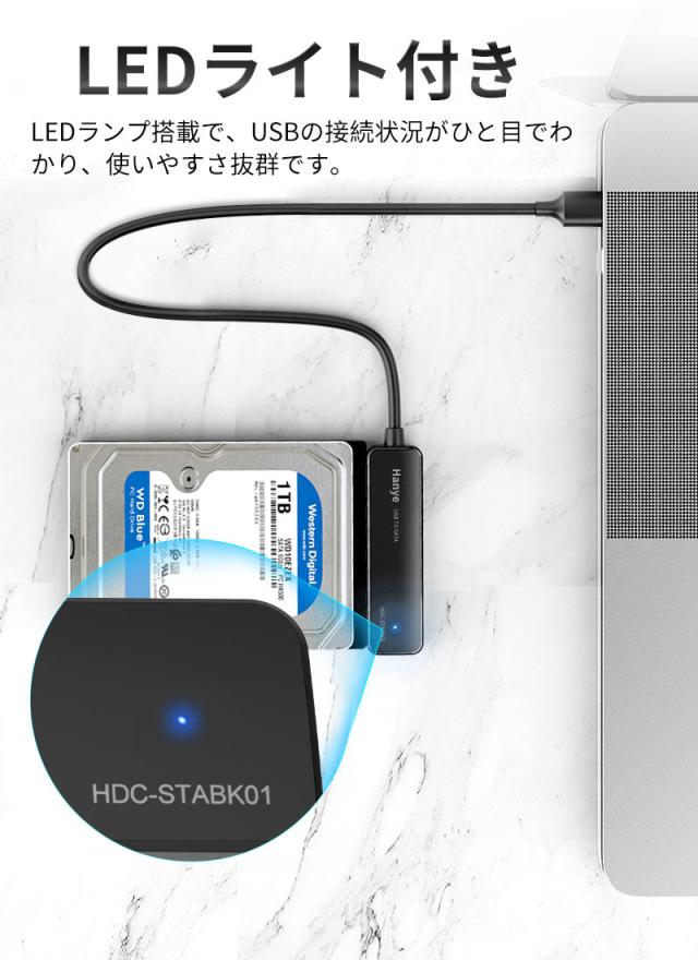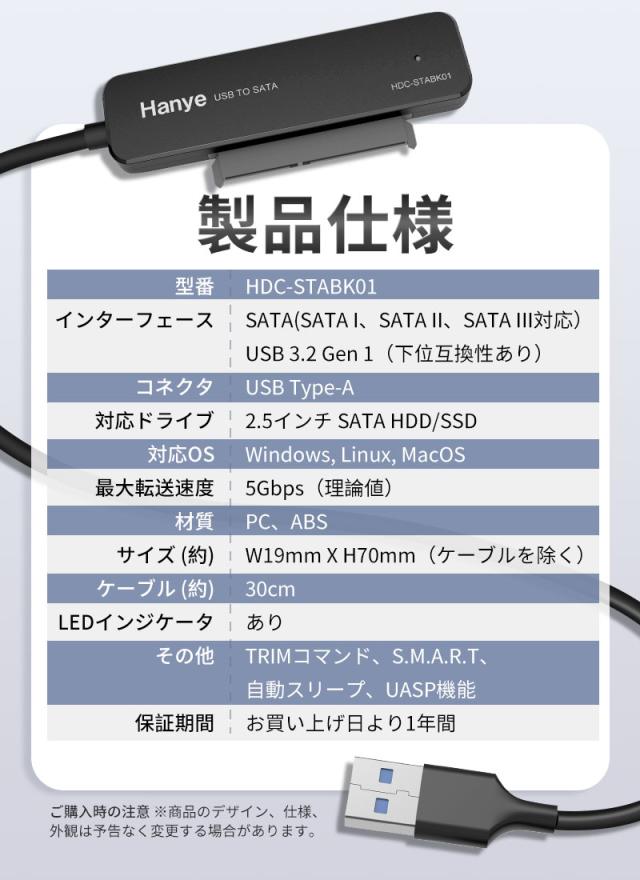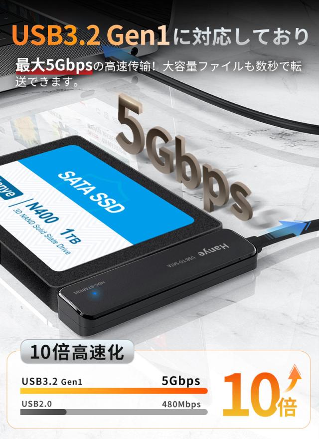 内蔵用HDD/SSDドライブをUSBで簡単に接続できるSATA USB 3.0 変換アダプタ! SATA I、SATA II、SATA IIIのインタフェースに対応できます。 高速データ転送 UASP&TRIMによる転送スピードアップ! USB3.2 Gen 1で最大5Gbps(USB2.0の約10倍)の転送速度で転送可能! ※UASPでの動作には、UASP対応ホストインターフェースとWindows8.1以降またはMac OS 10.8以降のOSが必要となります。 省電力と長寿命 自動スリープモード機能付きでエネルギーを節約し、HDD/SSDを保護します! LEDインジケータとS.M.A.R.T機能で動作状態を一目で分かります。 ※S.M.A.R.T機能のご利用には、接続している設備の両方がS.M.A.R.T機能をサポートしている必要があります。 使いやすい このSATA USB 変換アダプタを介して、HDTV、ルーター、PS4 / PS3、Xbox、PCなどに簡単に接続でき、ドライバー不要で挿すだけで認識可能です。 軽量&コンパクト コンパクトサイズで、出張や旅行の場合には最適です。 ケーブル長は30cmと短めなので、絡まる心配もありません。 幅広い互換性 PC/TV/ルーター/PS4など様々な設備に対応可能です。 Windows/ Linux/ MacなどのOSに対応可能です。 ※本製品はSATA接続の2.5インチHDD/SSD専用です。 |