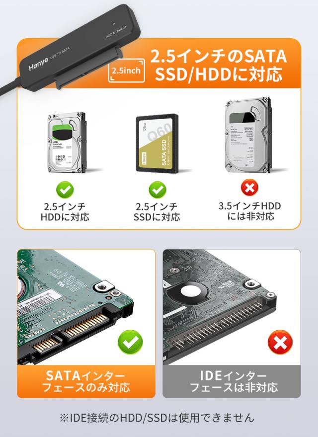 インターフェース:SATA(SATA I、SATA II、SATA III対応) USB 3.2 Gen 1(下位互換性あり)