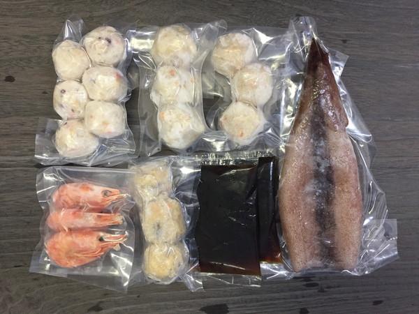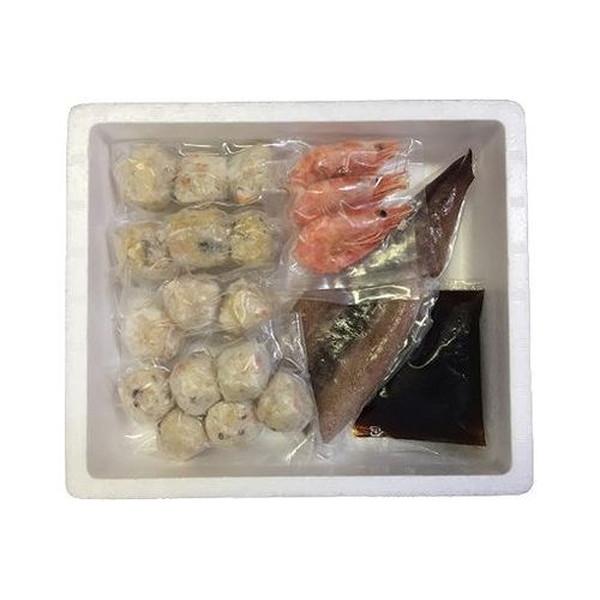 かに入つみれ×3個、えび入つみれ×3個、とりごぼうつみれ×3個、たこ入つみれ×6個、ボイル海老×3尾、ツボ抜きいか100g×1尾、たれ(濃縮:醤油仕立て)50ml×2袋