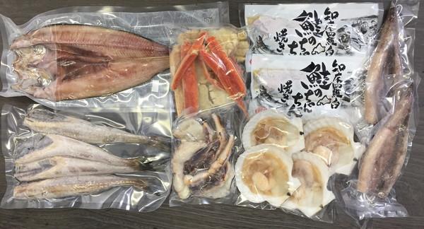 ゆでずわいがにカット300g×1、生たらばがにカット200g×1、帆立片貝75g×4、鮭のちゃんちゃん焼き80g×2、添付味噌たれ30g×2袋、ツボ抜きいか100g×2、姫鱈一夜干し50g×4、ほっけ(開き)一夜干し200g×1