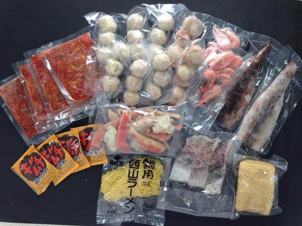 白菜キムチ100g×4、ボイル海老12尾、ボイル帆立6個、ゆでずわいがにカット200g、かに入つみれ6個、えび入つみれ6個、とりごぼうつみれ6個、ツボ抜きいか100g×2、油揚げ2枚、助宗鱈切身40g×3、冷凍生ラーメン80g×1、たれ(濃縮:キムチ仕立て)30g×4