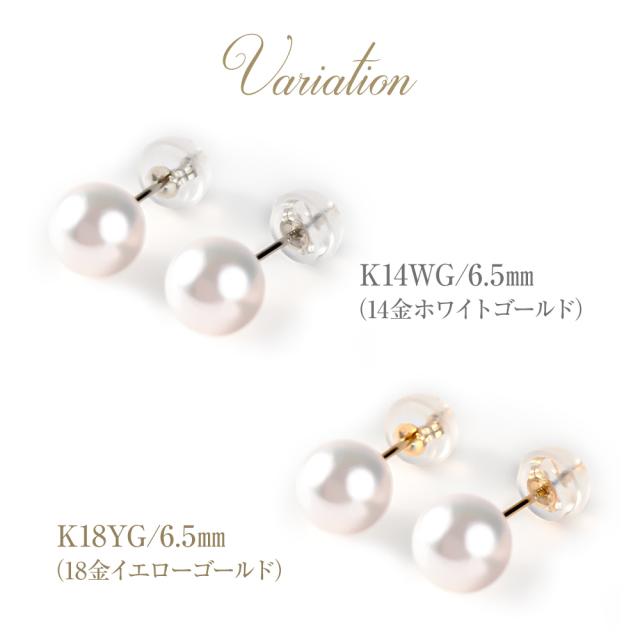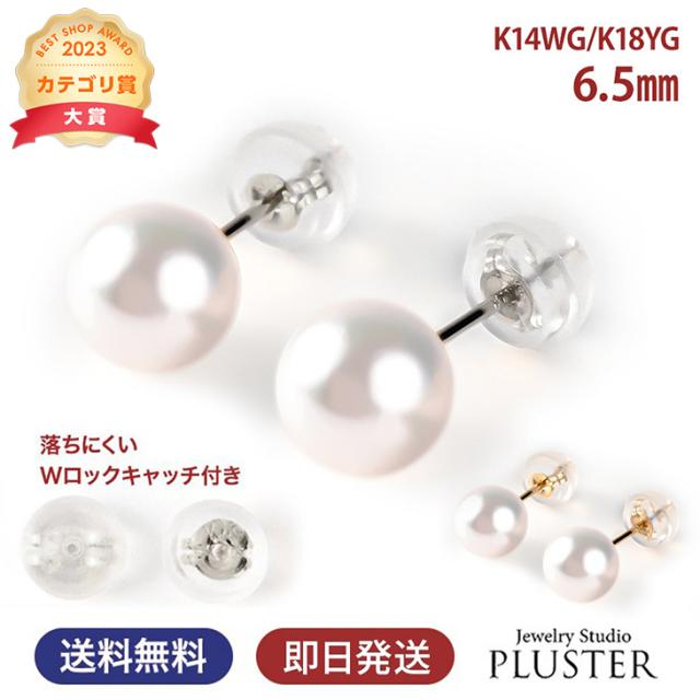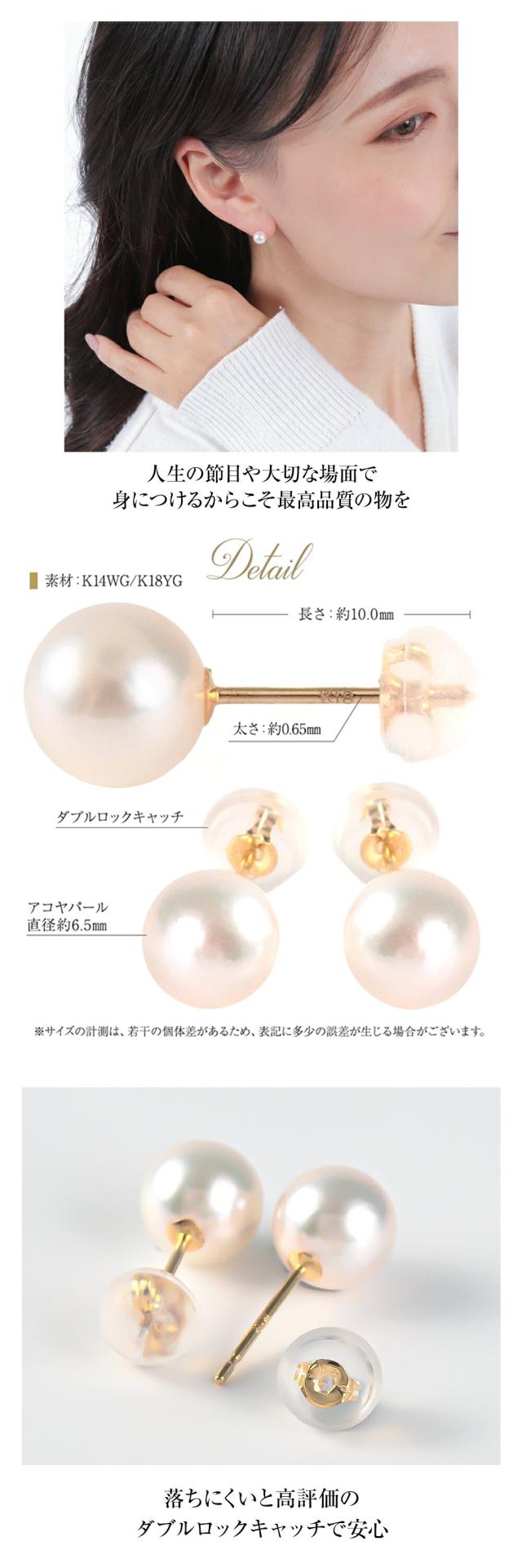 《 商品詳細 》| ピアススペック | 真珠 6.5mm 素材 K14WG/K18YG ポスト太さ:0.65mm(ダブルロックキャッチ) |