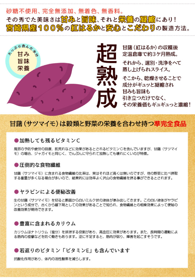 宮崎県産のさつまいも(紅はるか)を100%使用した干し芋です。