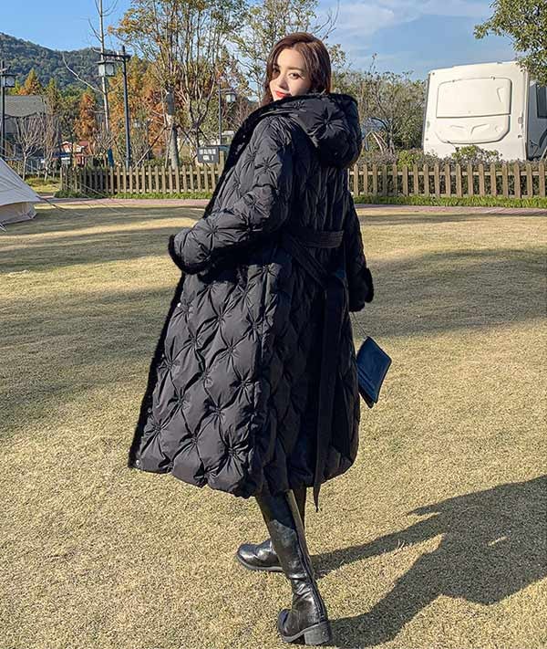 ダウンコート レディース ミモレ丈 冬服 ファー ダウン ダウンジャケット アウター 冬 ファー リボン かわいい 学生 通勤 女の子 カジュアル 着痩せ コート 長袖 袖あり 厚手 膝丈 防寒 寒さ対策 冷え対策 フード付き ポケット付き 秋冬 ふんわり 柔らかい 軽い着心地 あったか 暖かい オフホワイト ブラック 大きいサイズ L