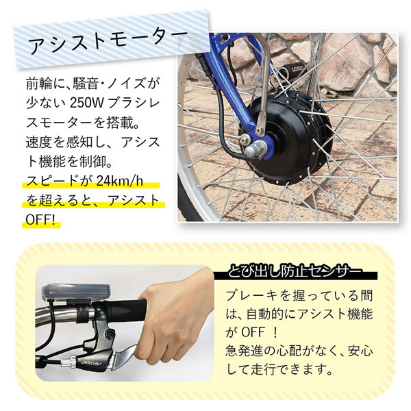 | 仕様 | アシスト機能・シングルギア・スイング機能・ワンタッチコントローラー・LEDライト・前カゴ(樹脂製大型)・後カゴ(メッシュ)・前輪錠(スペアキー付)・耐摩耗タイヤ |
