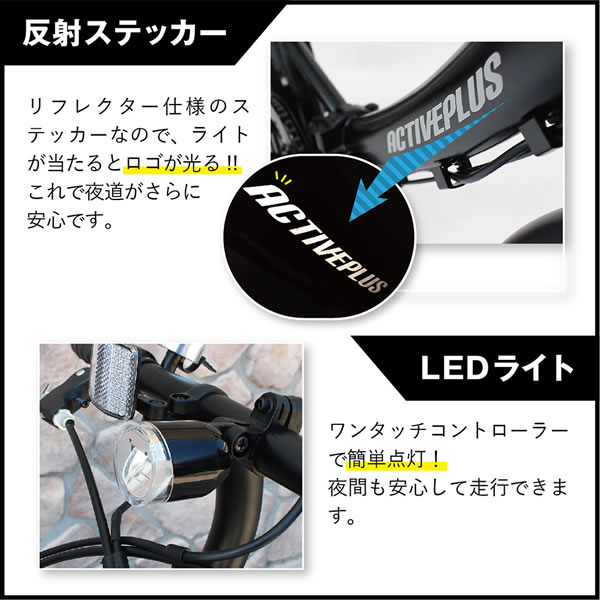 | 仕様 | アシスト機能・ノーパンクタイヤ・折畳みフレーム・折畳みハンドル・シングルギア・LEDライト・ワンタッチコントローラー・フロントキャリア・反射ステッカー・サークルキー(バッテリー共通キー) |