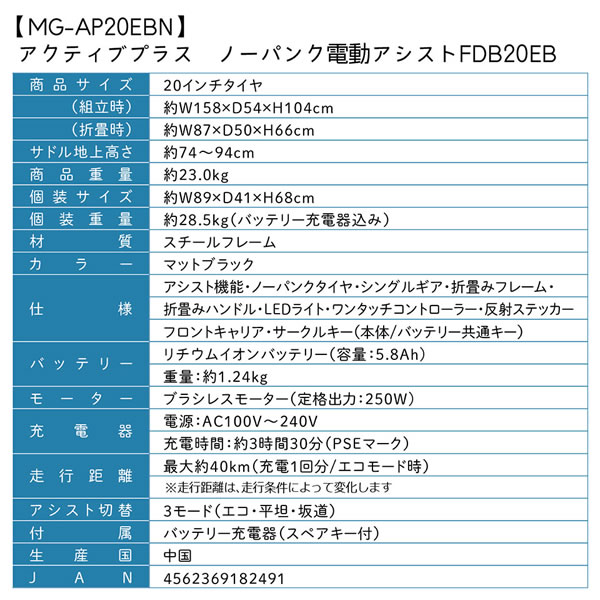 【メーカー直送】折りたたみ自転車 ノーパンクタイヤ 20インチ 電動アシスト自転車 ACTIVE PLUS アクティブプラス FDB20EB MG-AP20EBN