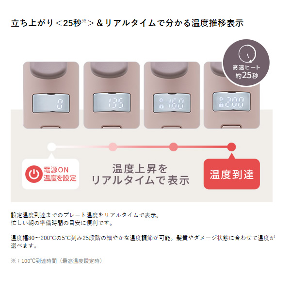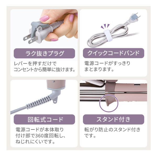クセをしっかり伸ばしてからカールアレンジができるスチーム2WAY ■サイズ(約) ストレート時:幅32.0×奥行3.4×高さ8.5cm カール時:幅32.0×奥行3.4×高さ6.5cm ■質量(約):390g ■プレート最高温度(約):200℃ ■パイプ径(約):26mm ■イオン機能:○ ■電源:AC100-240V(50/60Hz) ■消費電力(約):850W ■電源コード長さ(約):1.7m ■付属品:クイックコードバンド ※記載は商品仕様の一部です。仕様説明不足等の理由での返品はできません。特に適合等は必ずご確認ください。