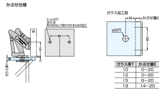 ●施工後に扉の三次元調整ができます。 ●開閉を繰り返しても調整が緩みにくい構造です。 【仕様】 ●扉の三次元調整機能(前後±3mm、上下±6mm、かぶせ〔左右〕±6mm) ●使用温度:5度〜35度 ●使用湿度:10%〜90% 【用途】 ●博物館・美術館・店舗の超大型ガラスショーケース ●商業施設の光壁 【注意】 ●ガラスサイズは耐荷重を優先して決めてください。 ●不特定多数の出入りのある扉としては使用しないでください。 ●扉は約90゜では止まらないため、これ以上開かないように戸当りを別途設けてください。 ●扉の比重や大きさ、形によって最大耐荷重まで使用できない場合がありますので、ご使用前に扉サイズの目安をご確認ください。 ●丁番は扉の上下から50〜100mmの位置に取り付けてください。 ●調整方法については、取扱説明書を必ずお読みください。 【推奨ねじ】 ●枠側:六角穴付ボルトM8 ガラス厚T:A:B:スペーサー厚C 10:30:75:— 12:40:77:10 15:40:80:10 ガラス厚T:かぶせ量E 10:0〜20 12:0〜20 15:6〜20 19:14〜20 【材料】 ガラス繊維入プラスチック 【色】 グレー 【サイズ】 ガラス厚:10、12、15(19:受注対応) 【開き角度】90度 【耐荷重N】981 /2ヶ 【耐荷重kgf】100 /2ヶ 【注文コード】170-027-451 【品番】MFH-100G-01-03 [ 輸入 ] このマークの製品は輸入品のため「寸法・色調・作動感のばらつき」や、予告なく仕様変更等を行う場合があります。 製品内容は、部品としての品質範囲です。この部品を使用した最終製品の機能・性能・安全を保証するものではありません。 ※画像はイメージです。 ※パッケージ、仕様、品番などの変更が予告なく変更される場合が御座います。 カテゴリー |