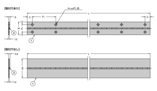 取付穴ピッチ(C、P1、P2)は木工用向けに現物合せ(直付方式)となっています。板金および取付穴ピッチに制限がある取り付けには適しませんので、ご注意ください。