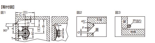 ●ユニバーサルディスクダンパーUDD型を、上開き扉に使用するためのブラケットです。 【注意】 ●扉上部と天板との隙間を少なくするため、筐体を図2および表2を参考に面取り加工をしてください(推奨)。 ●筐体には戸当たりを設けてください。 ●全開状態を保持しないため、別途キャッチを設けてください。 ●アクリルまたはガラスの扉を使用する場合は、SDSガラス扉用フェイスプレート、スペーサーSDS-50G型をご使用ください。 表1 No.:扉厚T:A:B:C:D:E (1):5:46:70:49:(95):(26) (2):15:54:82:57:(111):(40) (3):18:57:86:60:(117):(44) ※(1)は扉厚5mmのアクリルまたはガラスを使用し、SDSガラス扉用フェイスプレート、スペーサーSDS-50G型を使用した際の値です。 (2)(3)は表記の厚みの木扉を使用した際の値です。 表2 面取り加工の残りF:目地G 1:3 2:4 3:5 【材料】 ステンレス鋼(SUS304) 【仕上】 素地 【注文コード】180-026-764 【品番】UDD-BKT 製品内容は、部品としての品質範囲です。この部品を使用した最終製品の機能・性能・安全を保証するものではありません。 ※画像はイメージです。 ※パッケージ、仕様、品番などの変更が予告なく変更される場合が御座います。 カテゴリー |