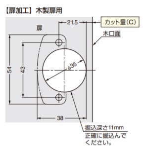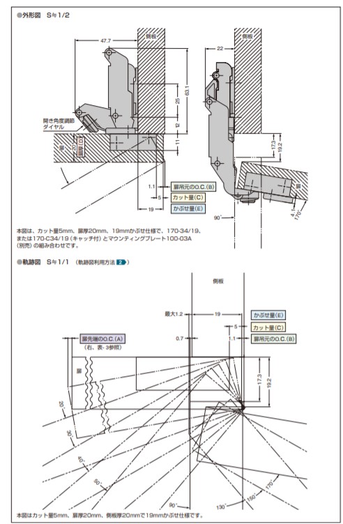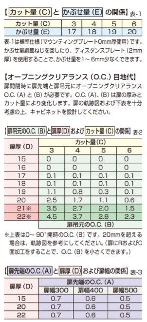170度開き 19mmかぶせ 適応かぶせ量15〜20mm カップ径φ35掘込深さ11mm推奨扉厚15〜20mm 取付座金100シリーズ ●開き角度調節ダイヤルを回すことで、開き角度を140度〜170度の範囲で調節できます。 【別売品】 ●100シリーズマウンティングプレート(取付座金) 【推奨ねじ】 ●呼び径3.5皿、または丸皿頭タッピンねじ、または木ねじ 写真はスライド丁番本体と別売のマウンティングプレートの組み合わせです。 【カット量(C)とかぶせ量(E)の関係】表-1 カット量(C):3:4:5:6 かぶせ量(E):17:18:19:20 表-1は標準仕様(マウンティングプレート0mm厚使用)です。 かぶせ量調節ねじを回したり、ディスタンスプレート(2mm厚)を使用することで、かぶせ量を1〜6mm少なくできます。 【オープニングクリアランス(O.C.)目地代】 扉開閉時に扉先端と扉吊元にオープニングクリアランスO.C.(A)と(B)が必要です。 O.C.(A)、(B)は扉の厚みとカット量により変化します。扉の軌跡図および下表を十分考慮の上、キャビネットを設計してください。 【扉吊元のO.C.(B)と扉厚(D)およびカット量(C)の関係】表-2 扉厚(D):カット量(C)(3:4:5:6) 15:0:0:0:0 16:0:0:0:0 17:0.1:0.1:0.1:0.1 18:0.1:0.1:0.1:0.1 19:1.1:0.8:0.3:0.1 20:2.5:1.7:1.1:0.6 21※:3.5:2.7:2.0:1.5 22※:4.5:3.7:2.9:2.3 扉吊元のO.C.(B) ※上表は0〜90度開時のO.C.(B)です。20mmを超える場合は、軌跡図を参考にしてください。(扉にRおよびC面加工をすることで、O.C.(B)を小さくできます。) 【扉先端のO.C.(A)と扉厚(D)および扉幅の関係】表-3 扉厚(D):扉先端のO.C.(A)(扉幅300:扉幅400:扉幅500) 15:0.7:0.6:0.5 20:0.7:0.6:0.5 22:0.7:0.6:0.5 【仕様】 キャッチ付 【材料】 本体/鋼、カップ/亜鉛合金(ZDC) 【仕上】 サチライトクロムめっき 【注文コード】160-073-400 【品番】170-C34/19 取り付けには別売のマウンティングプレートと正面プレートが必要です。別途ご注文ください。 製品内容は、部品としての品質範囲です。この部品を使用した最終製品の機能・性能・安全を保証するものではありません。 ※画像はイメージです。 ※パッケージ、仕様、品番などの変更が予告なく変更される場合が御座います。 カテゴリー |